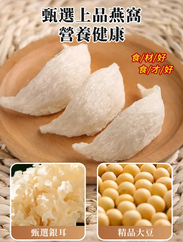 「喚醒美麗,啜飲天然的奢華」燕窩銀耳豆漿粉 每一杯燕窩銀耳豆漿,美味可口又方便,均衡的營養配比,不僅使您的皮膚得到深層滋養,還有助於減淡色斑,恢復皮膚自然光采!
